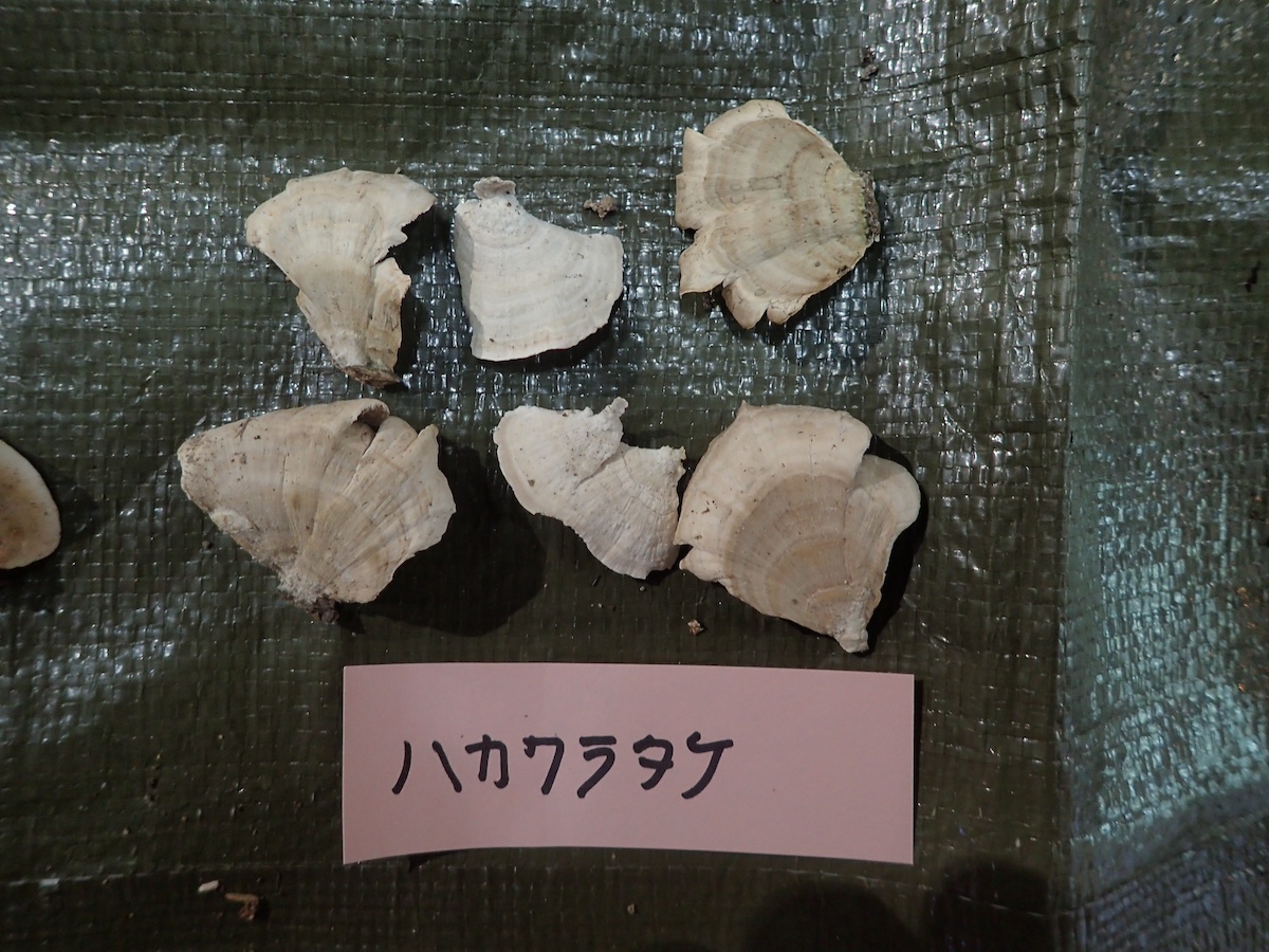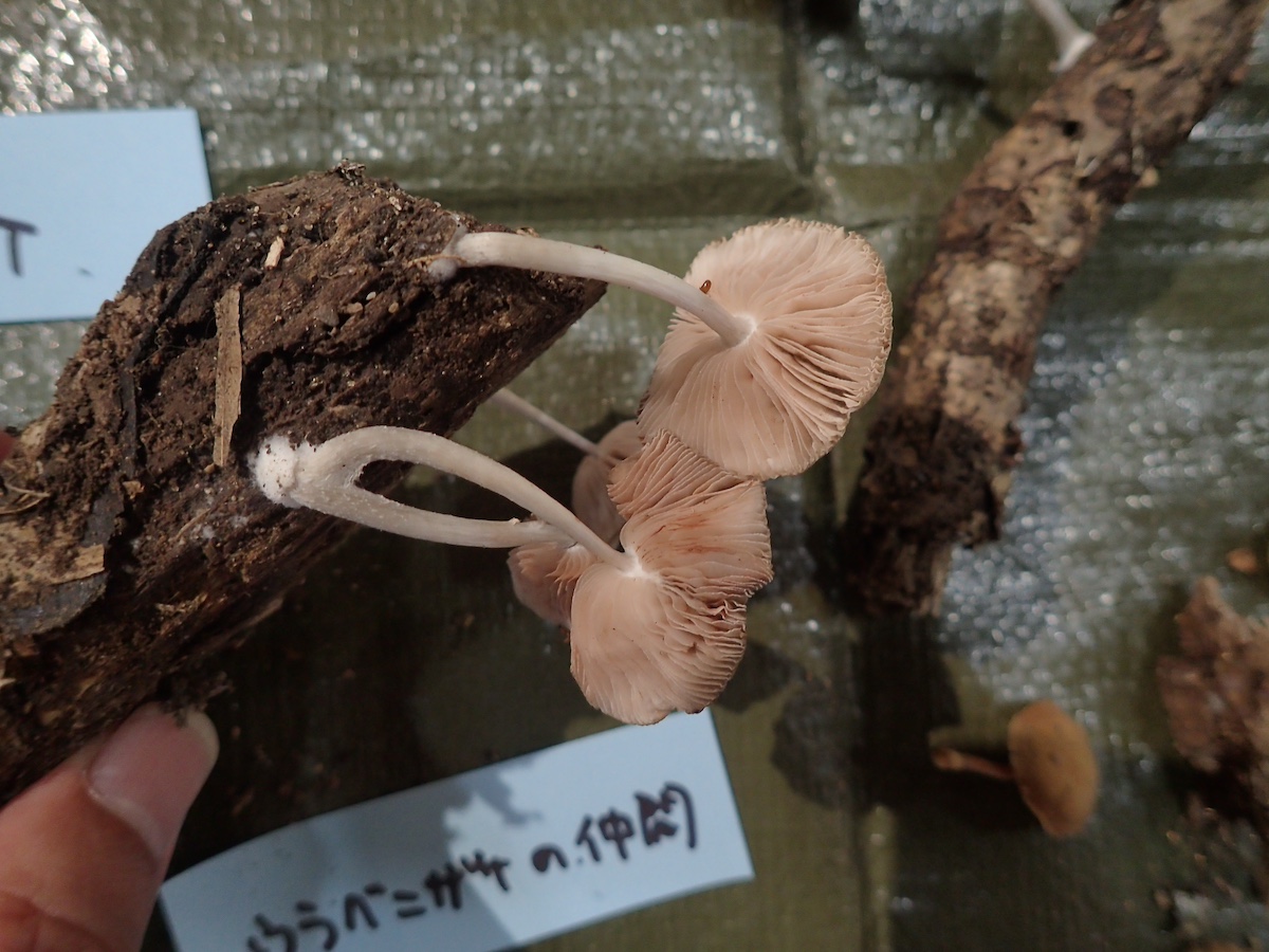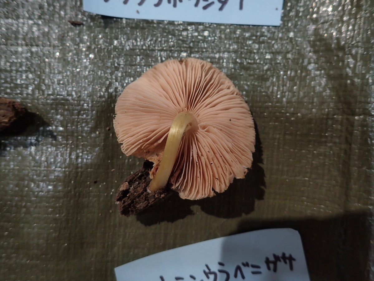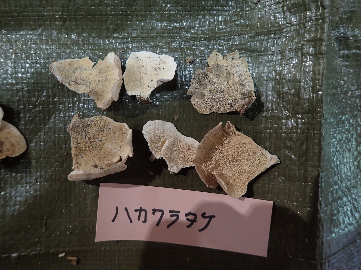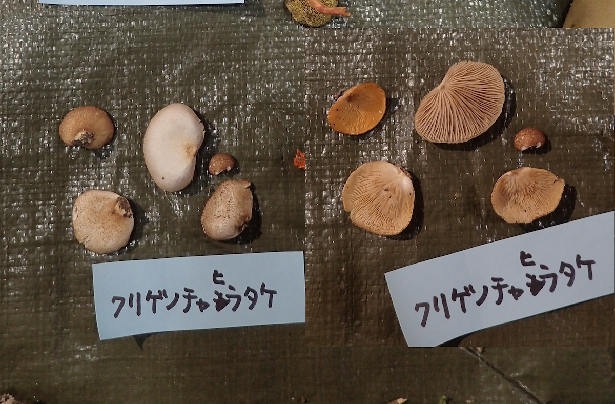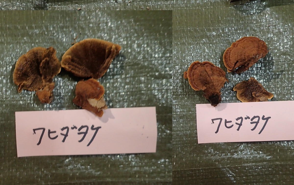 左から、ヒイロハリタケ、コウジタケ、ウラベニガサの仲間、同左裏面