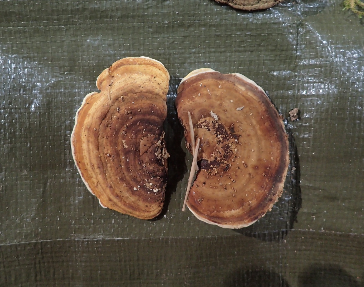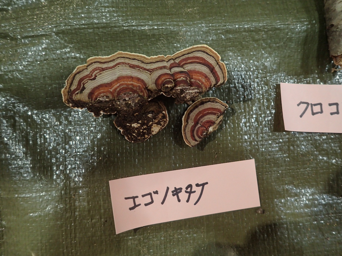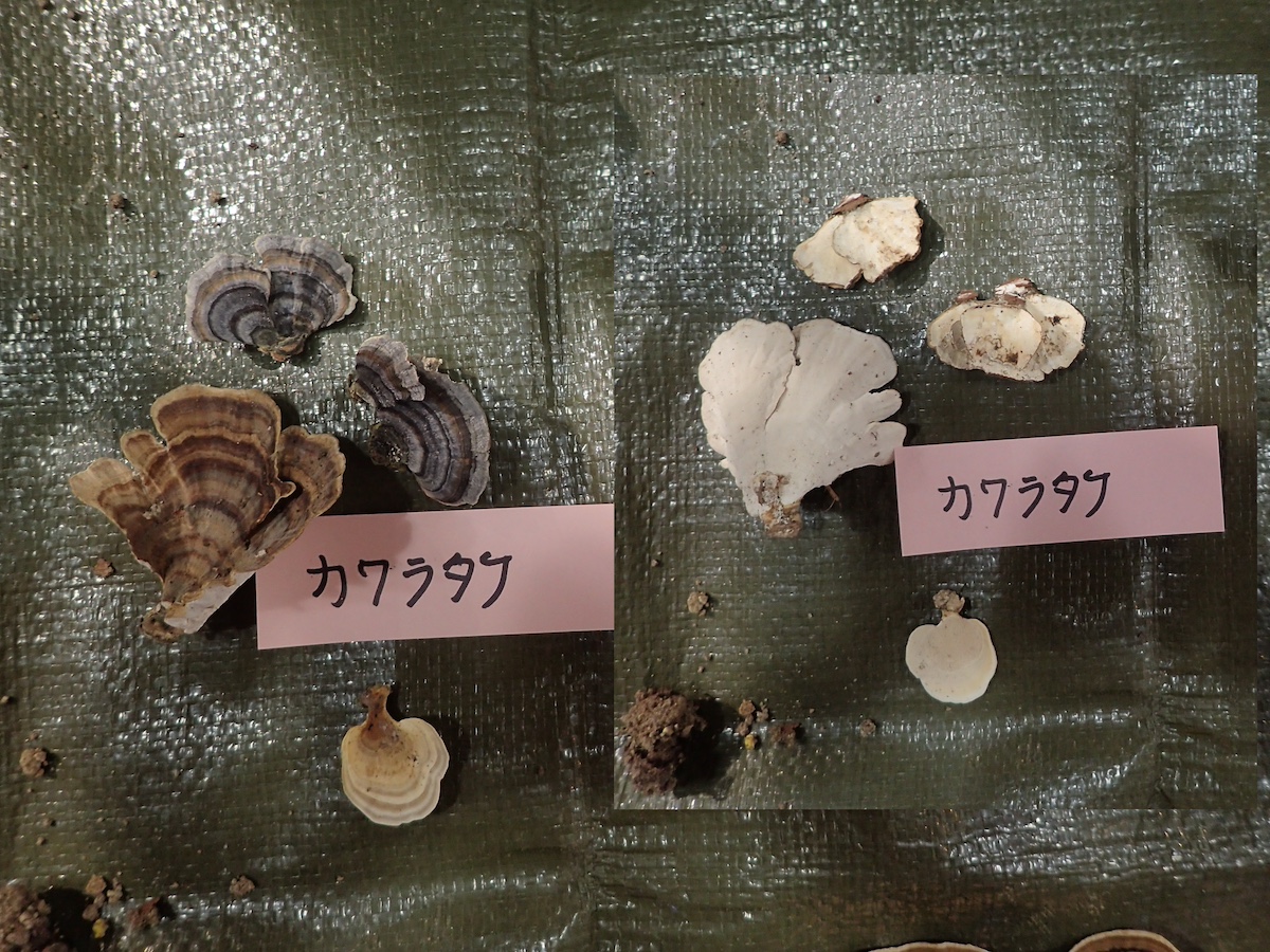 左から、カワラタケ(褐色型と黒色型)、キアシグロタケ、エゴノキタケ、同左裏面