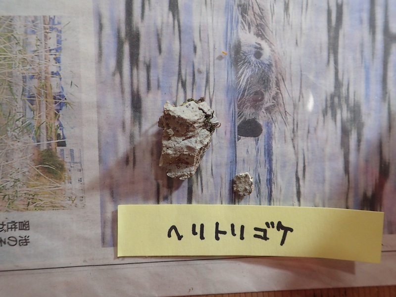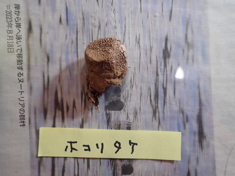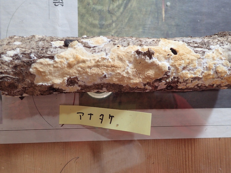 ホコリタケと付箋が付いていますが、地面からでなく木からはえていたようなので正確にはタヌキノチャブクロ。地面からだとホコリタケですがその別名がキツネノチャブクロというのでセットでおぼえられそうですね。