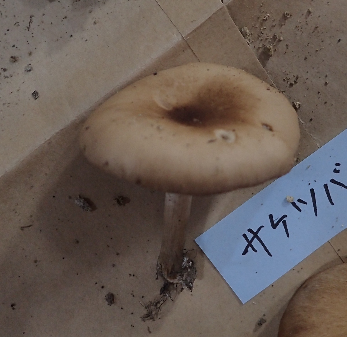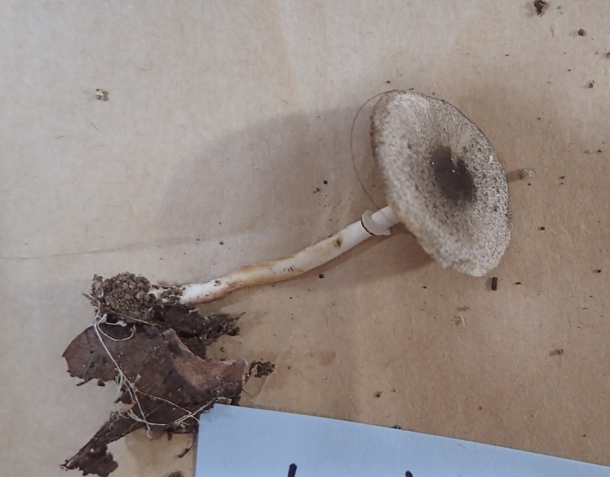サケツバタケの付箋が付いていますが、ツバが裂けてないこと、膜状で柄に輪状についてないことからツチナメコに近いと判断しました。
