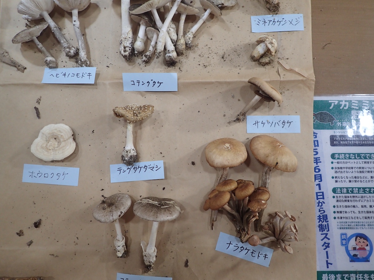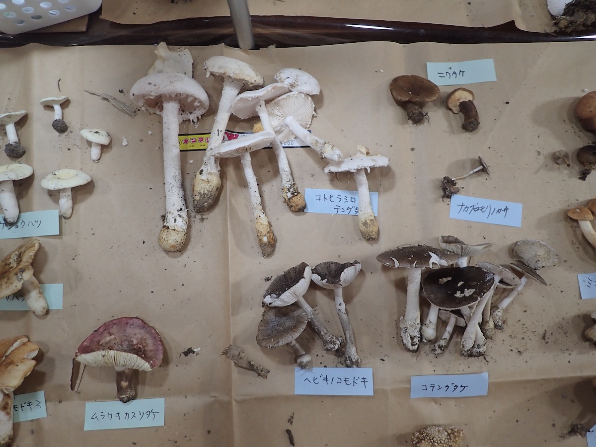 左から、ヘビキノコモドキ、シロテングタケ、ナカグロモリノカサ、ニワタケ