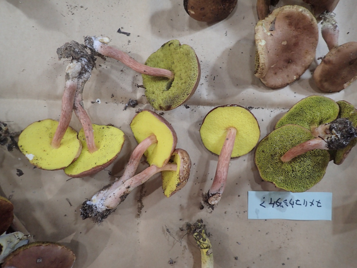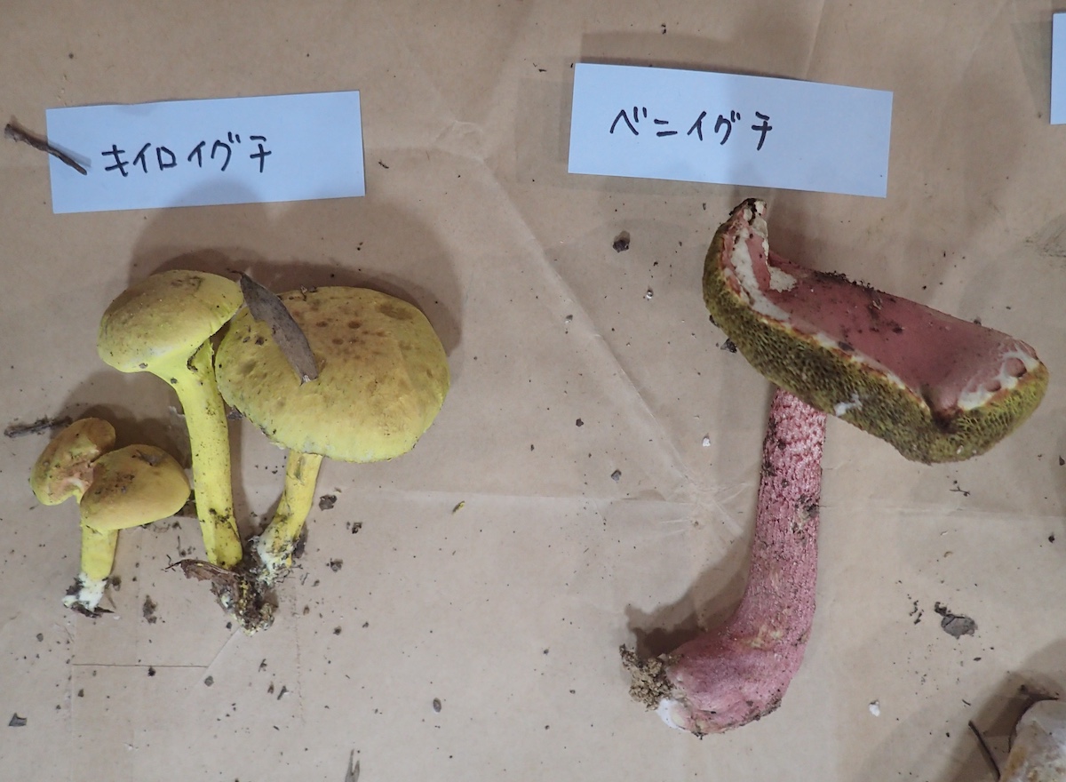 左から、キイロイグチとベニイグチ、キヒダタケ、キッコウアワタケ、ウスキテングタケ