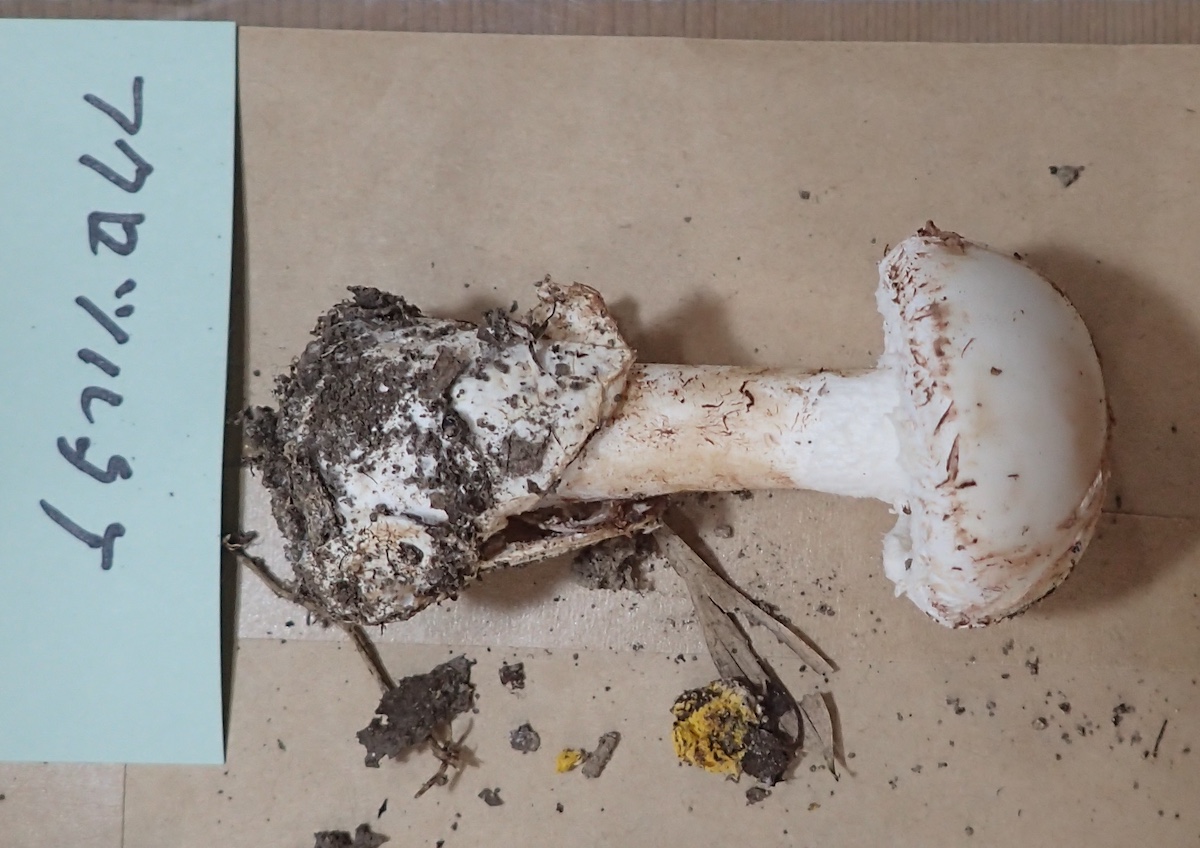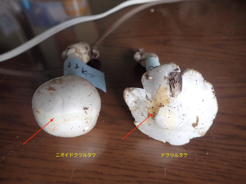 帰宅後、KOH液をかさに滴下して変色性を確かめました。ドクツルタケには黄変がみられますが、ニオイドクツルタケには変色が見られません。