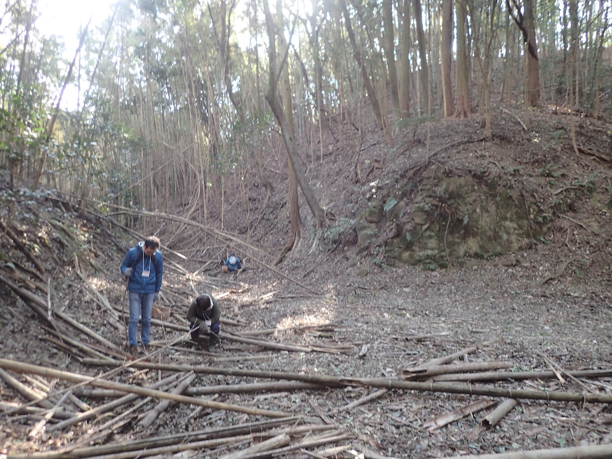 左から、椎茸が元気、カラカラの竹林、観察風景、森の様子