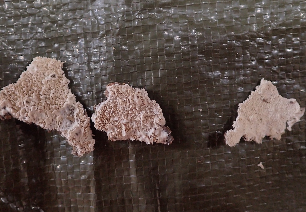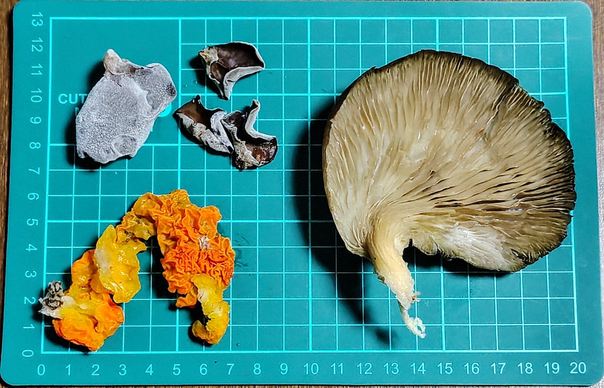 左から、オロシタケ(拡大)、ネンドタケモドキ、アラゲキクラゲ、モジゴケの一種・アカコブタケの一種・クロコブタケ
