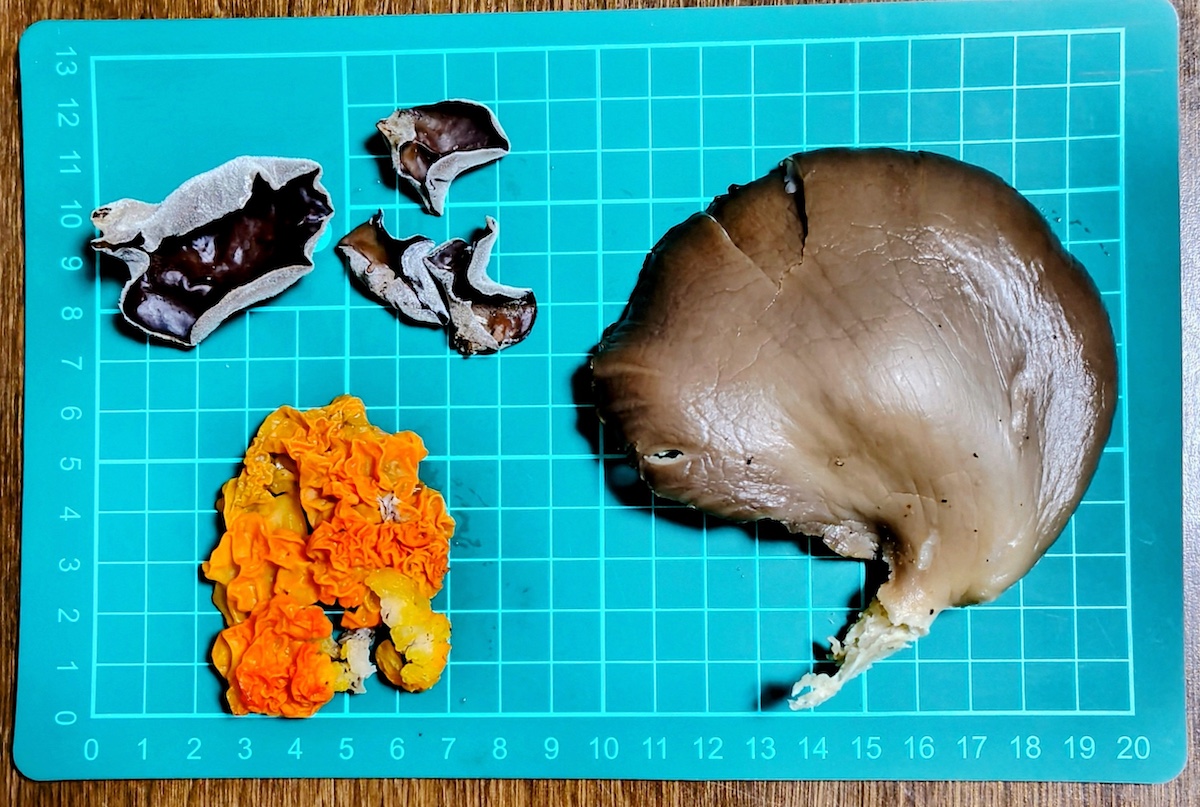 乾燥キノコの状態・・・左からヒラタケ、アラゲキクラゲ、コガネニカワタケ
